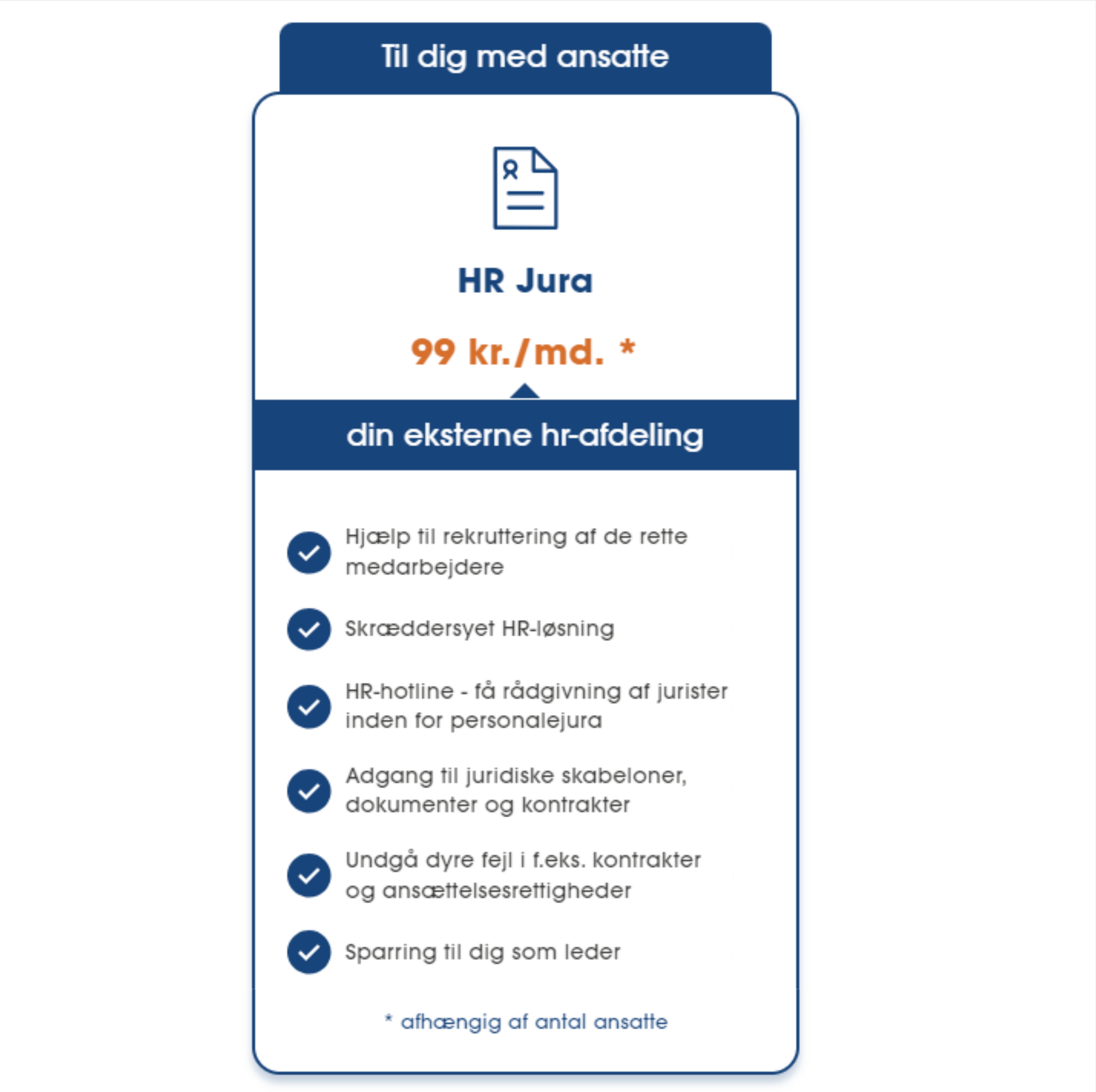 HR Jura er særligt til dig, der har ansatte og gerne vil have en ekstern HR-afdeling, som f.eks. kan rådgive om rekruttering, medarbejderforhold, overholdelse af love og vejlede i, hvad der er bedste praksis. Ases jurister sidder klar til at hjælpe og vejlede dig.