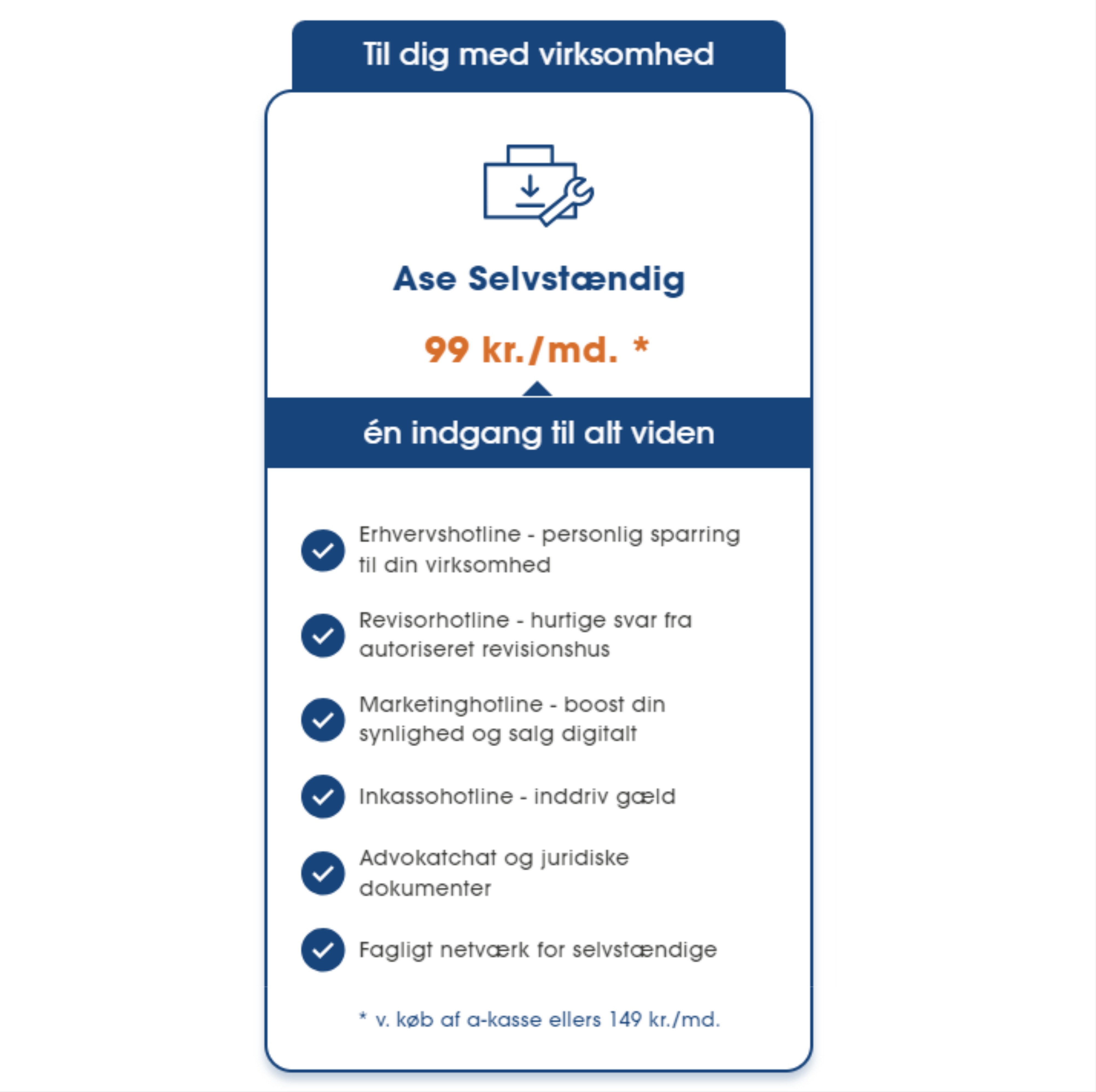 Ase Selvstændig er for alle med virksomhed. Om du har ansatte eller ej, så har Ase et produkt til dig, med adgang til eksperter inden for bl.a. jura, regnskab, marketing og HR, samlet i to enkle medlemskaber.